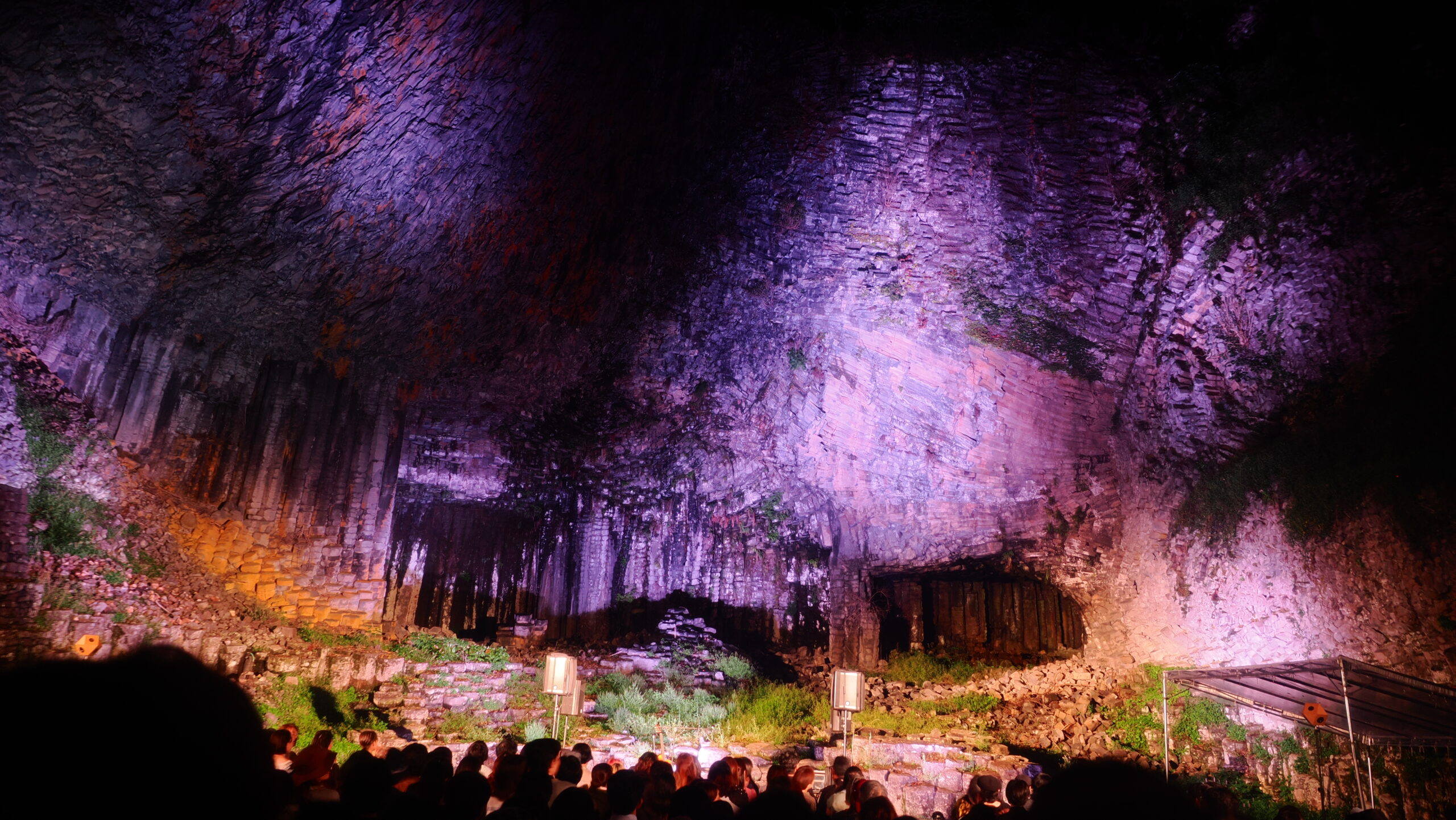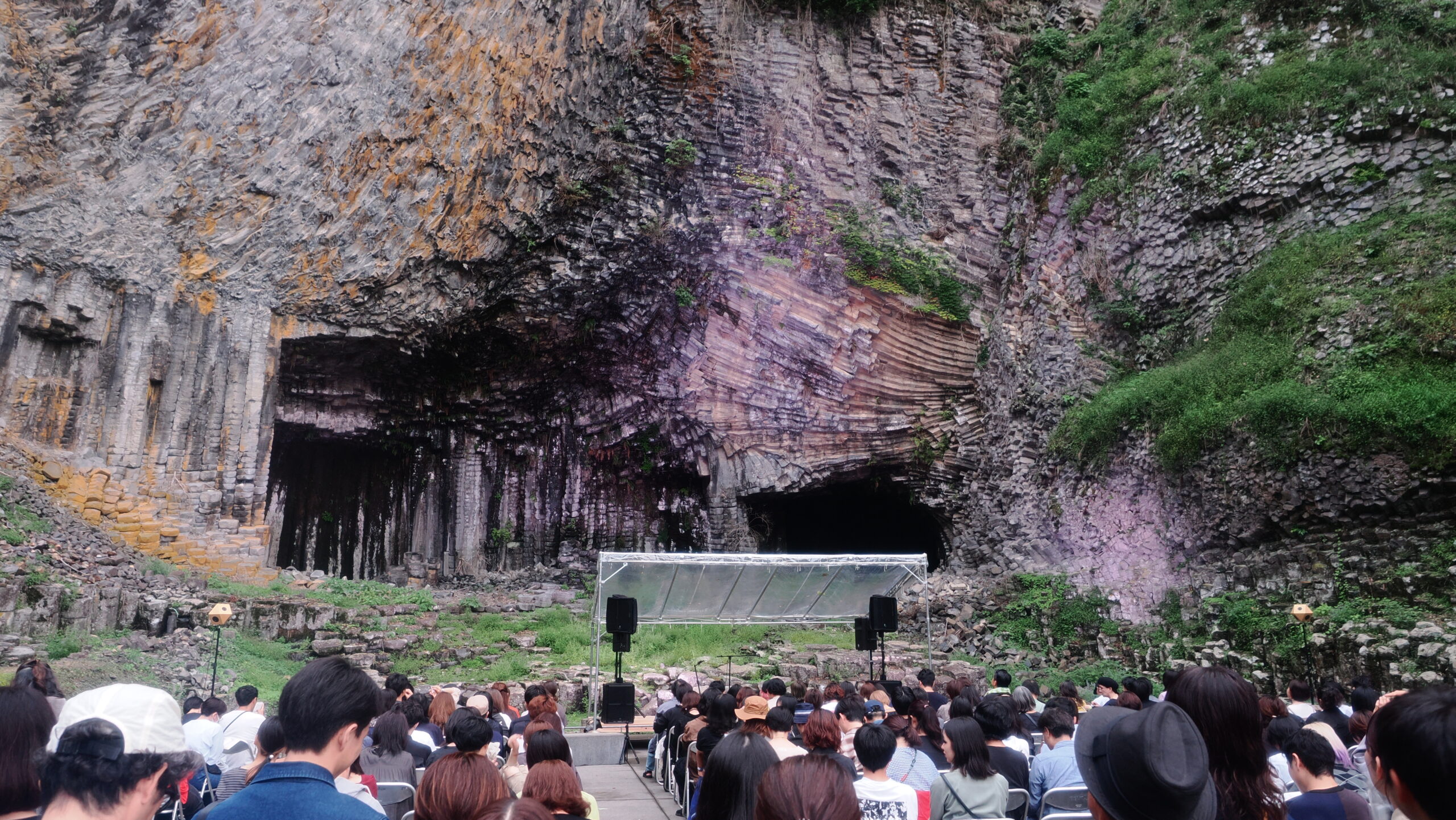 MCでは玄武洞について「後ろにすごいビジュアル」「先輩って感じがします」と触れた。暗くなりライトアップされた玄武洞に目を向ける観客。余談だが、玄武洞は理科の授業で誰もが習う「玄武岩」の語源であり、160万年前のマグマが固まって出来たガチ先輩である。